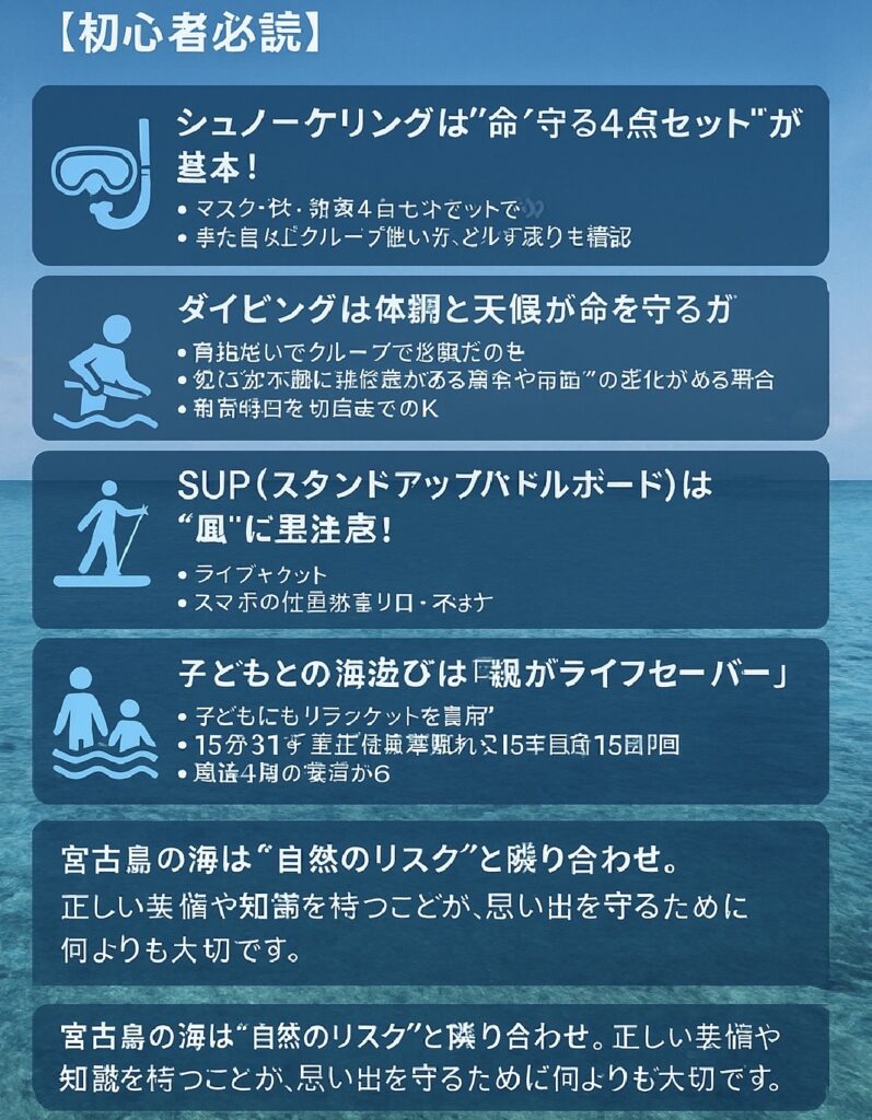 宮古島の青い海は、多くの旅行者を魅了する“楽園”。しかし、その美しさの裏側には、自然相手ならではのリスクも潜んでいます。大切なのは「正しい知識」と「備え」。このガイドでは、シュノーケリング・ダイビング・SUP・海水浴を安心して楽しむための豆知識を詳しくご紹介します。
