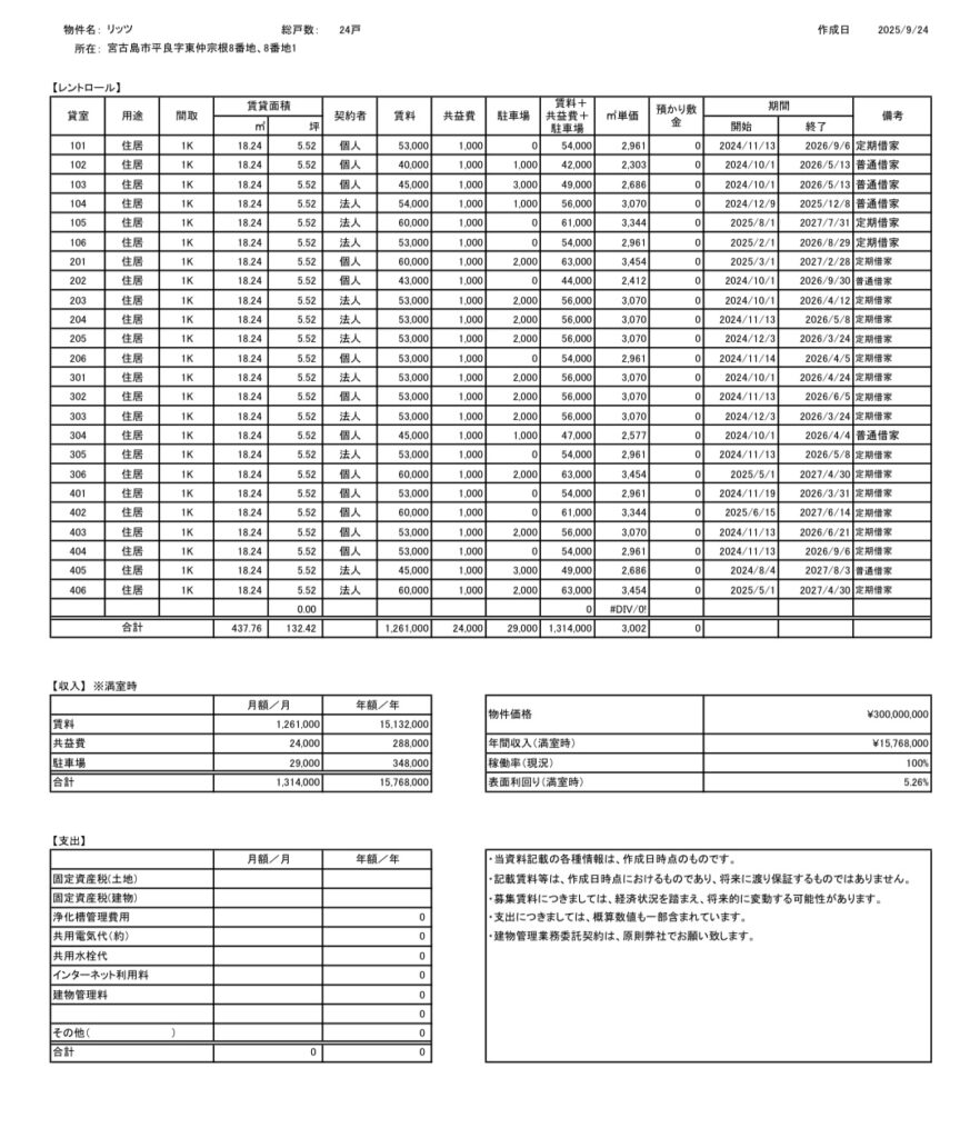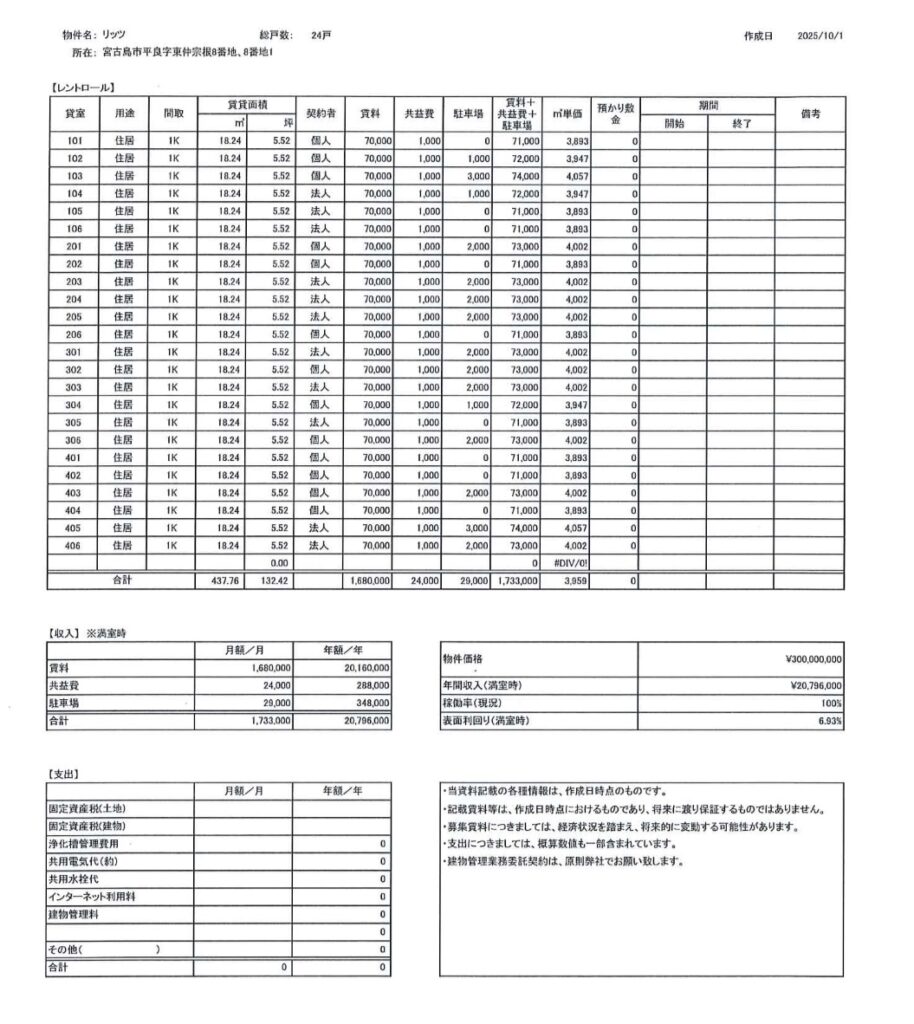 - 1室家賃収入に加え、**太陽光発電の売電収益(約93万円/年)**あり