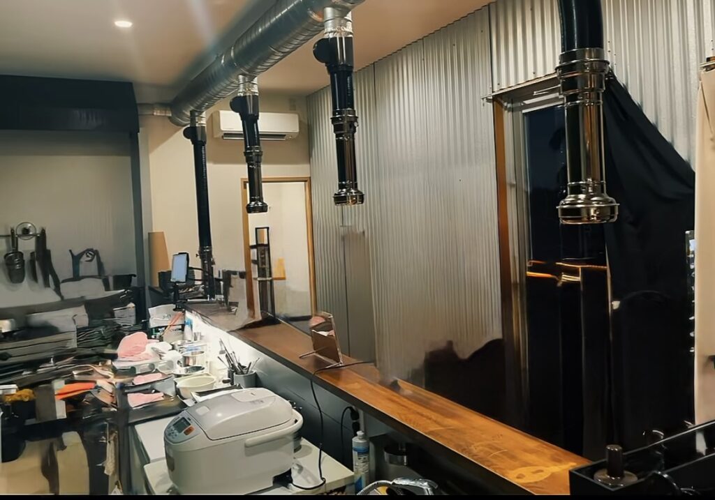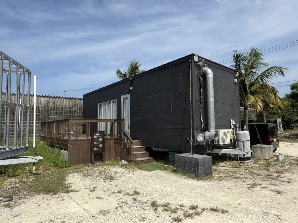 建物はコンテナを活用したモダンな造りで、外観は黒で統一されたシックな雰囲気。