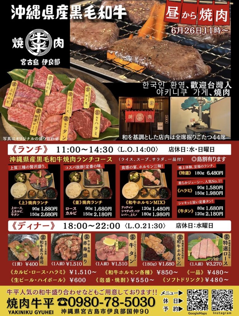 ランチタイムにはリーズナブルな焼肉定食(1,680円〜)が用意され、ディナーではコースや単品注文も可能。掘りごたつ席の落ち着いた店内は最大42席、個室もあり、家族連れやグループ旅行にもぴったりです。韓国語・中国語表記にも対応し、海外観光客にも親切なサービスが魅力。伊良部島で“昼から焼肉”が楽しめる貴重なお店として注目を集めています。