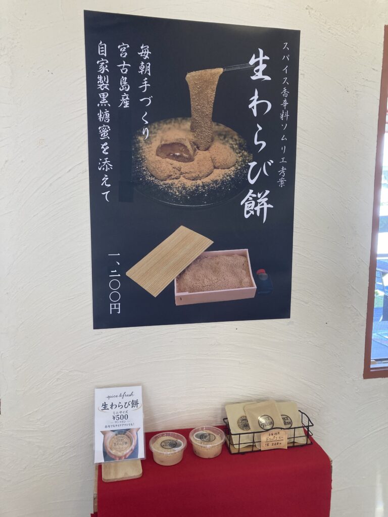 とろけるような柔らかさと、もちもち食感が楽しめる特製「生わらび餅」。スパイス香辛料ソムリエが素材のバランスを研究し、毎朝丁寧に手づくりしています。香ばしいきな粉と、宮古島産黒糖を使用した自家製黒糖蜜が相性抜群で、ひと口ごとに深い甘みが広がります。食後のデザートやちょっとした手土産にもぴったりの人気商品です。