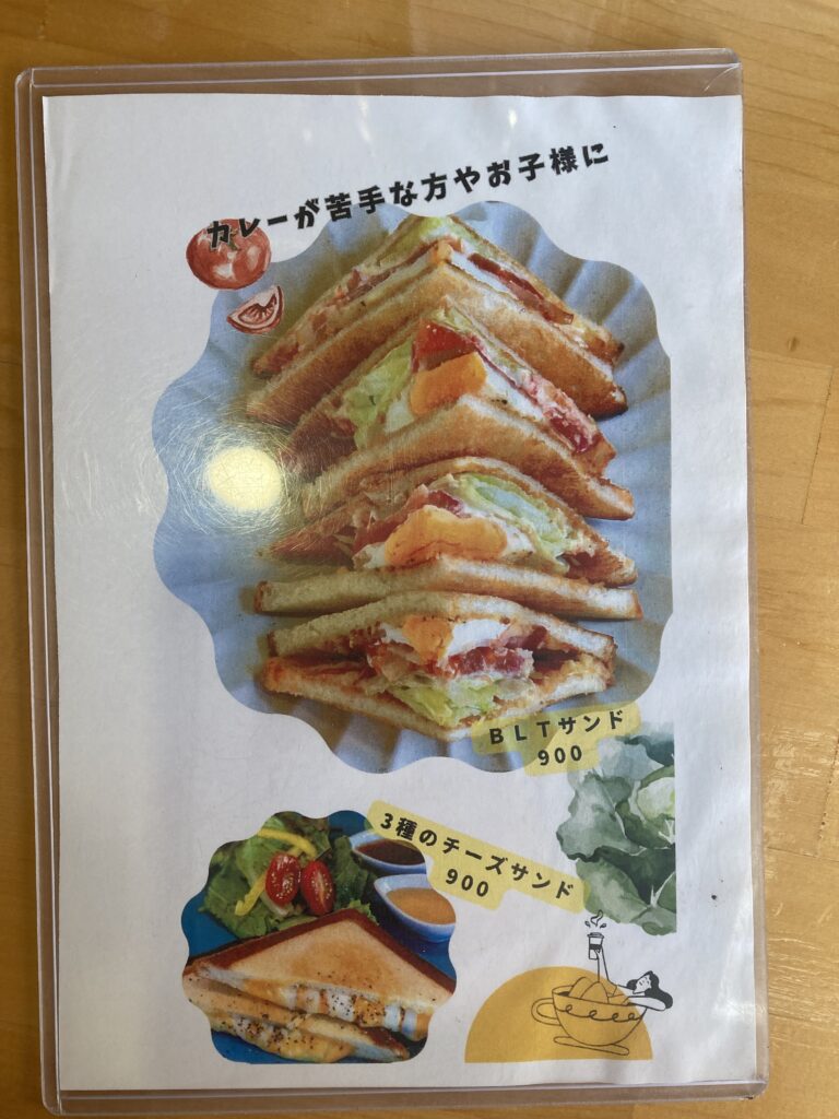 スパイスの香りに食欲がふくらむ本格カレーから、子どもでも食べやすいサンドメニューまで、幅広いラインナップを楽しめます。