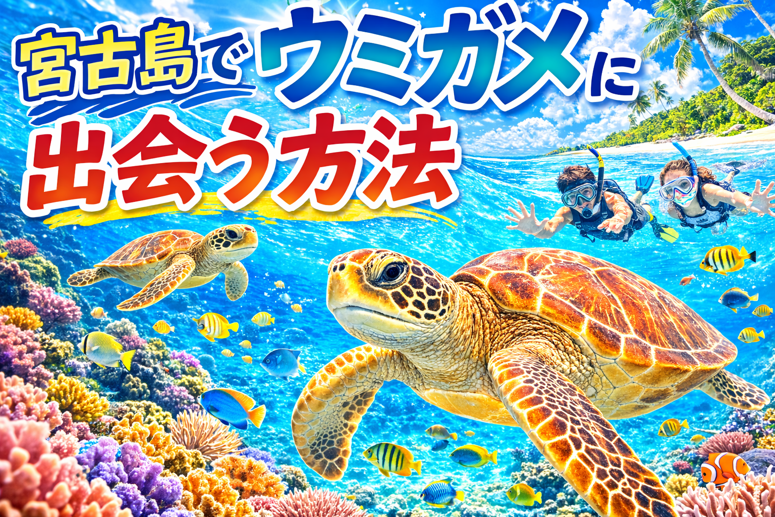 ウミガメツアー|宮古島の美しい海で海亀と泳ぐ感動体験!99%の遭遇率で、心に残る特別な思い出をつくろう 宮古島の美しい海で、海亀と間近で泳げる特別なツアー。砂浜からエントリーするため、船に乗らずに気軽に楽しめます。99% … 宮古島ウミガメツアー|感動の遭遇体験!